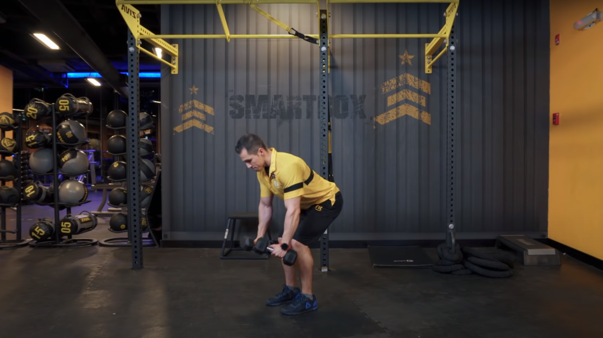 - Vuelve a tomar el elemento de peso que hayas conseguido (mancuernas, botellas de agua o costales)